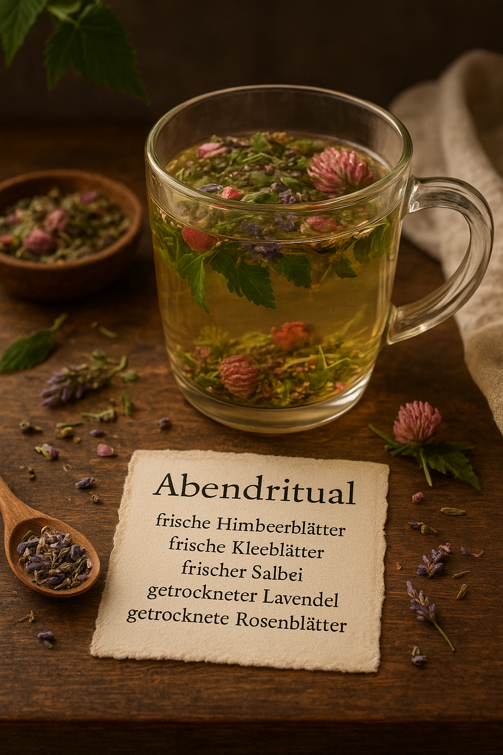 Wenn die Sonne langsam hinter den Feldern versinkt und die ersten Sterne blinken, erwacht die Magie des Abendritual-Tees. In ihm vereinen sich die sanften Blätter der Himbeere, die wie kleine Wächterinnen des weiblichen Körpers wirken, mit dem roten Klee, der das Herz weit öffnet. Salbei haucht Weisheit hinein, als würde eine alte Kräuterfrau Geschichten ins Ohr flüstern.